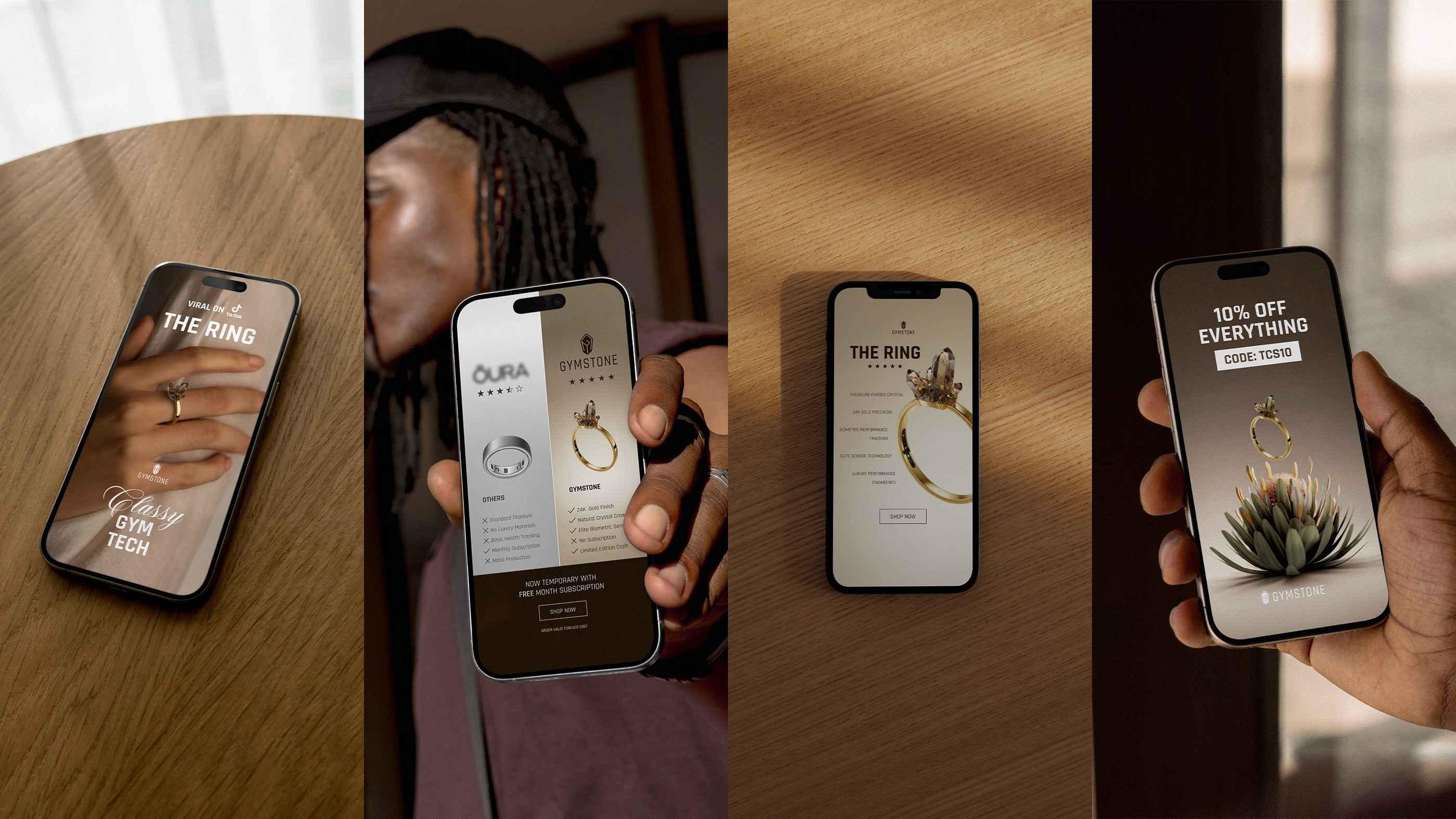 Voor dit fictieve concept ontwikkelde Tagline Creative Studio een volledig high-end performance merk vanaf nul. Gymstone positioneert zich op het snijvlak van luxury jewelry en biometrische technologie: een 24K gold performance ring met crystal crown en geïntegreerde sensortechnologie.