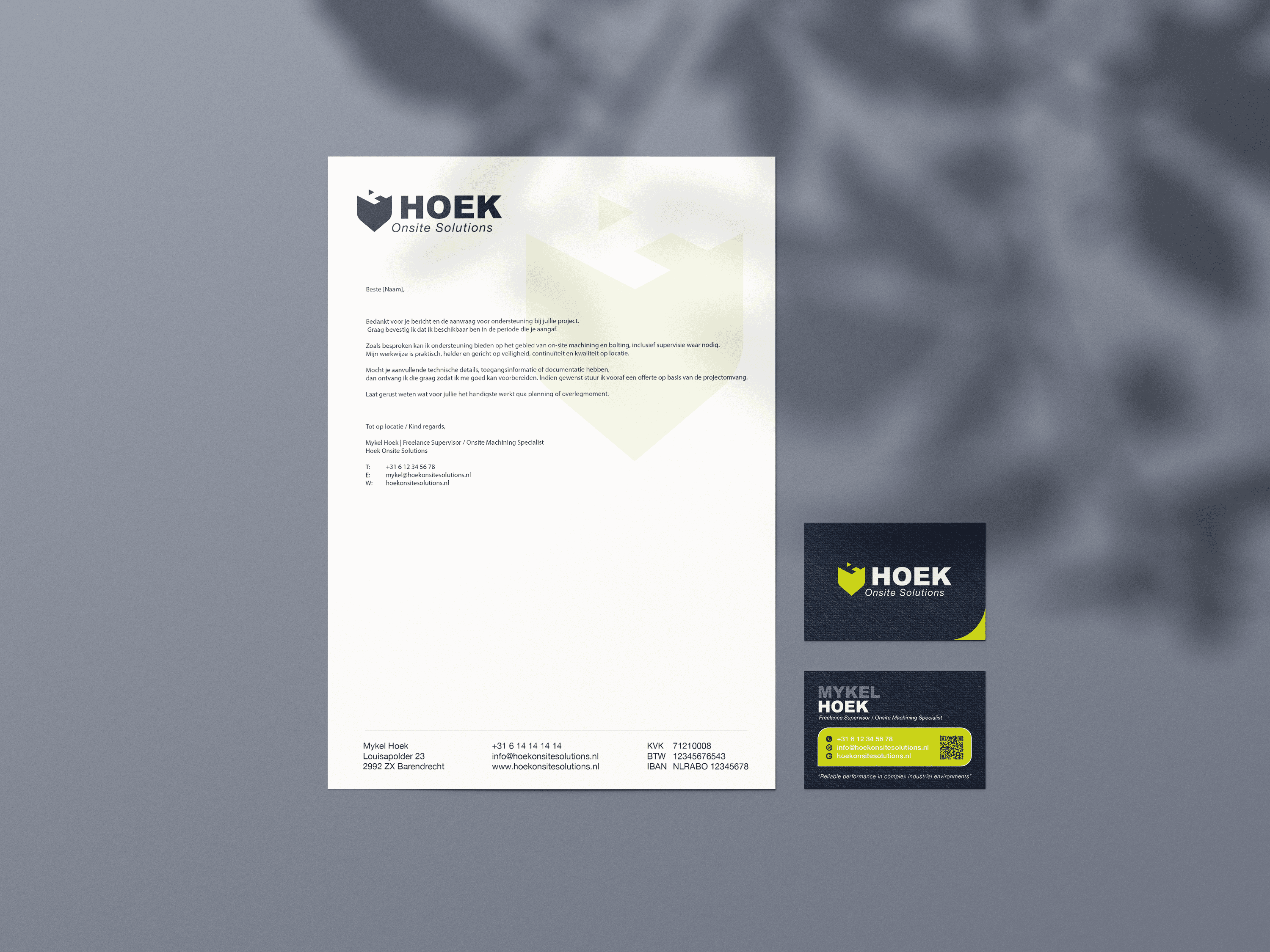 Voor Hoek Onsite Solutions ontwikkelde Tagline Creative Studio een complete merkidentiteit voor een freelance specialist in industriële onderhoudsprojecten. Het merk moest technische precisie, betrouwbaarheid en een no-nonsense mentaliteit uitstralen - passend binnen petrochemische en zware industriële omgevingen.